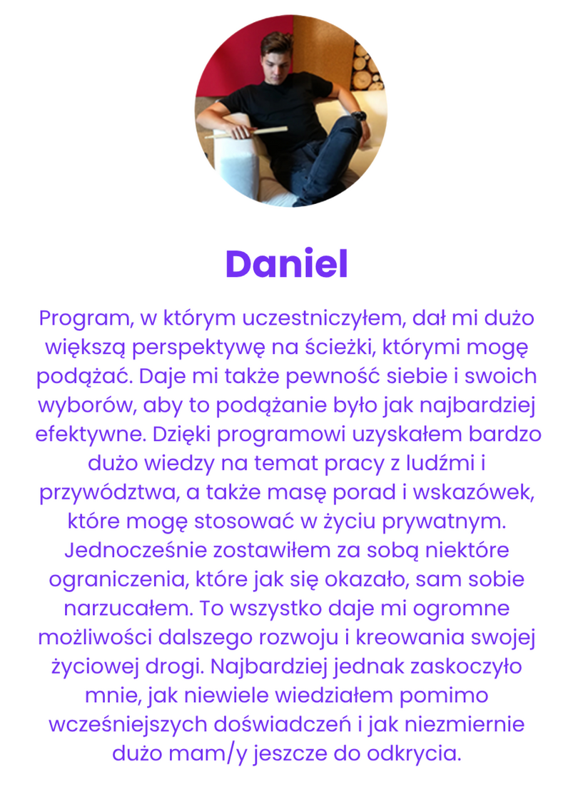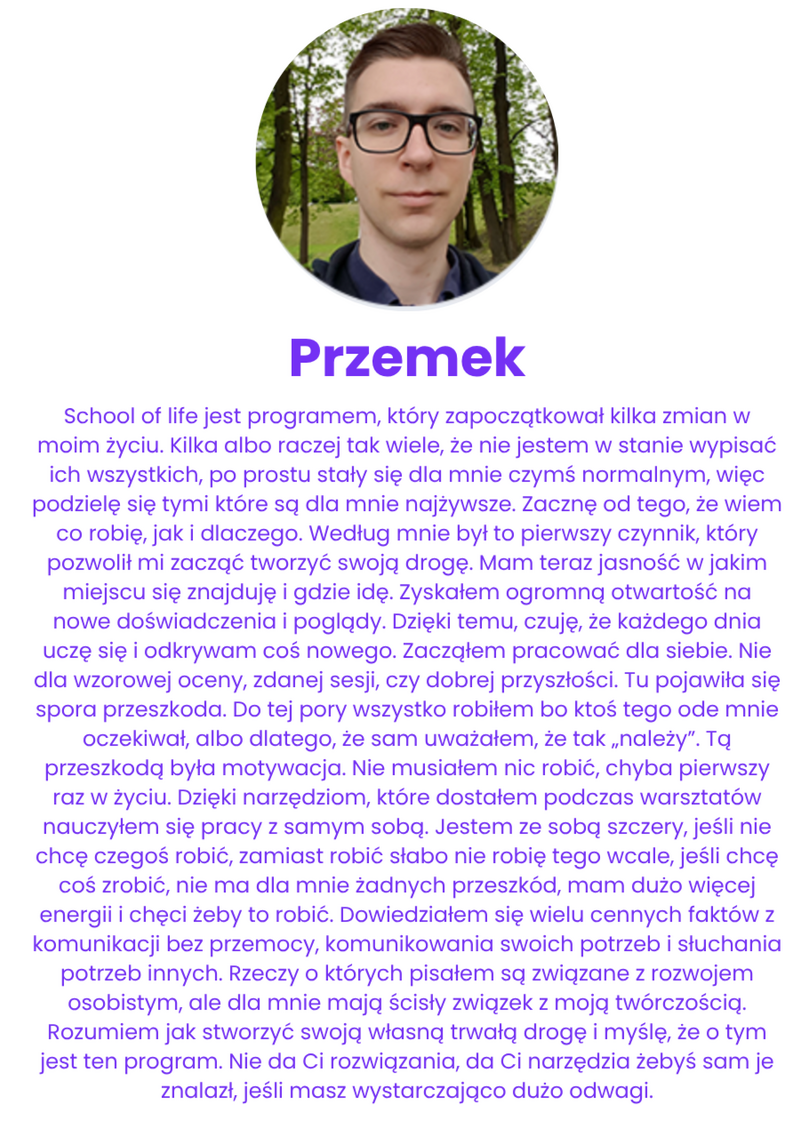 Od ponad 15 lat pomagam ludziom ruszyć z miejsca jako trener umiejętności miękkich, doradca ds. przedsiębiorczości i innowacji oraz certyfikowany coach. Pracuję z przedsiębiorcami, naukowcami, studentami i młodzieżą. Łączę doświadczenie biznesowe (Inkubartory, Bank Światowy, doradztwo startupowe) z rozwojem osobistym. W różnych programach Fundacji dzielę się narzędziami, których działanie sprawdziliśmy przez 6 edycji programu School of Life (teraz School of Life Quest). Narzędziami, które realnie działają i pozwalają ruszyć z miejsca lub dać Ci spokój i radość w procesie i w miejscu, w którym jesteś.